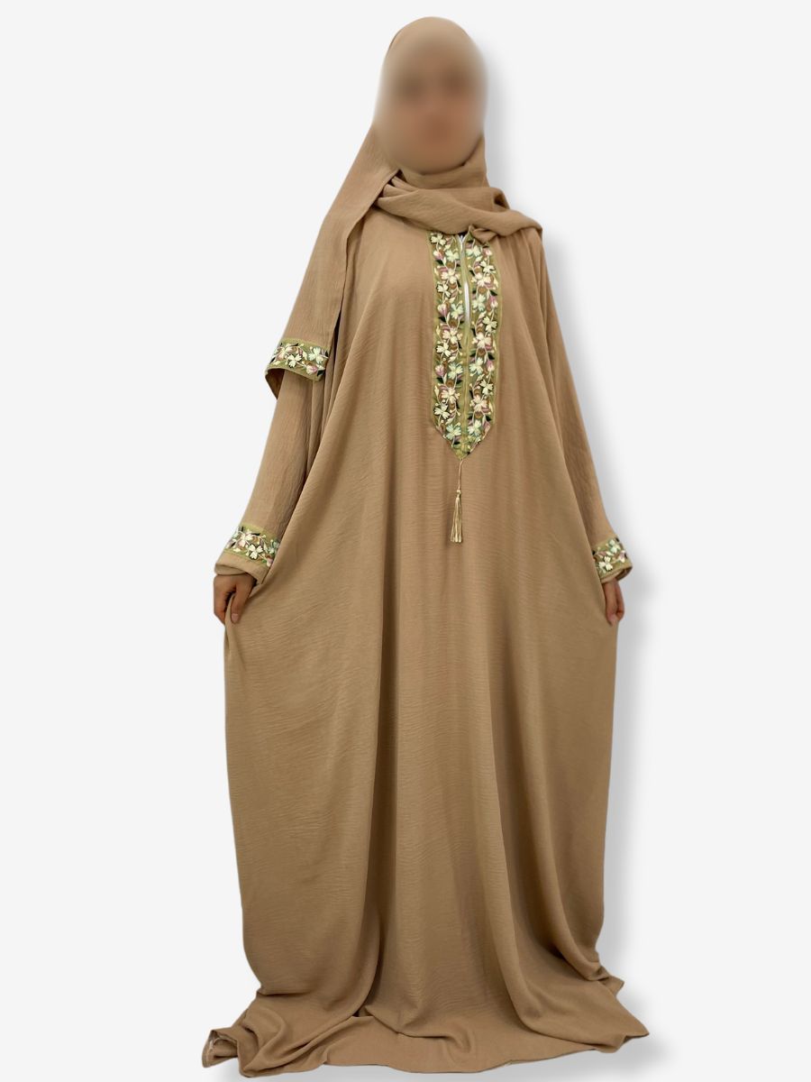 Robe de prière FATIMA – Beige sable avec broderie florale et hijab intégré