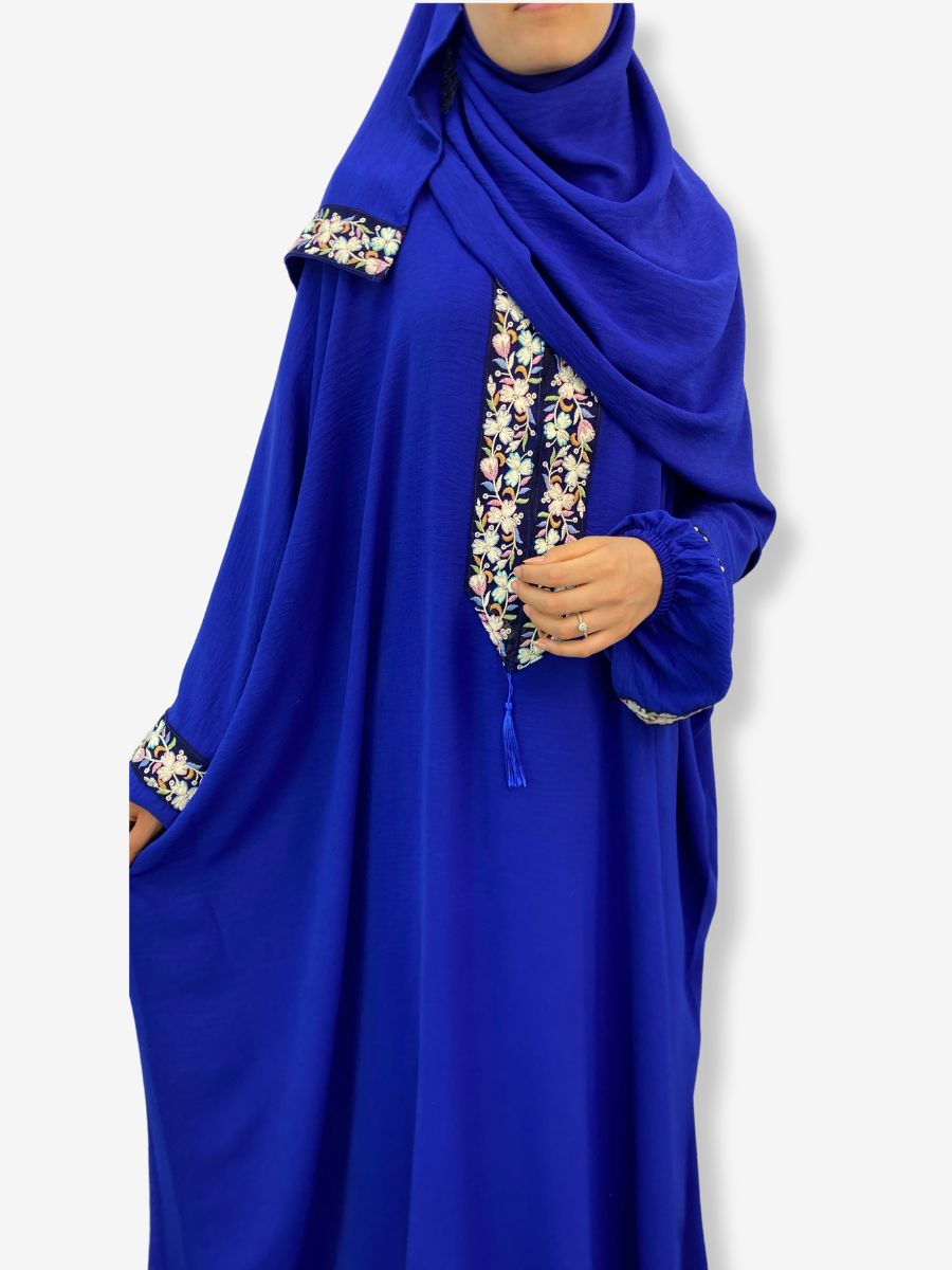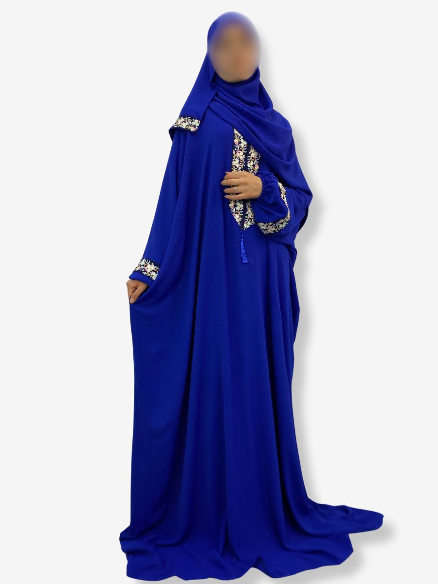 Robe de prière FATIMA – Bleu roi avec broderie florale et hijab intégré