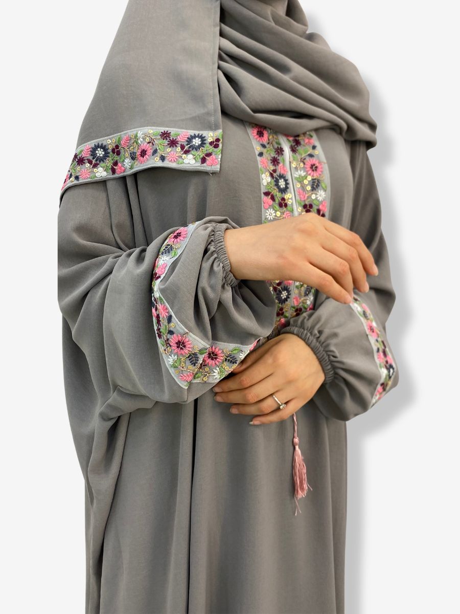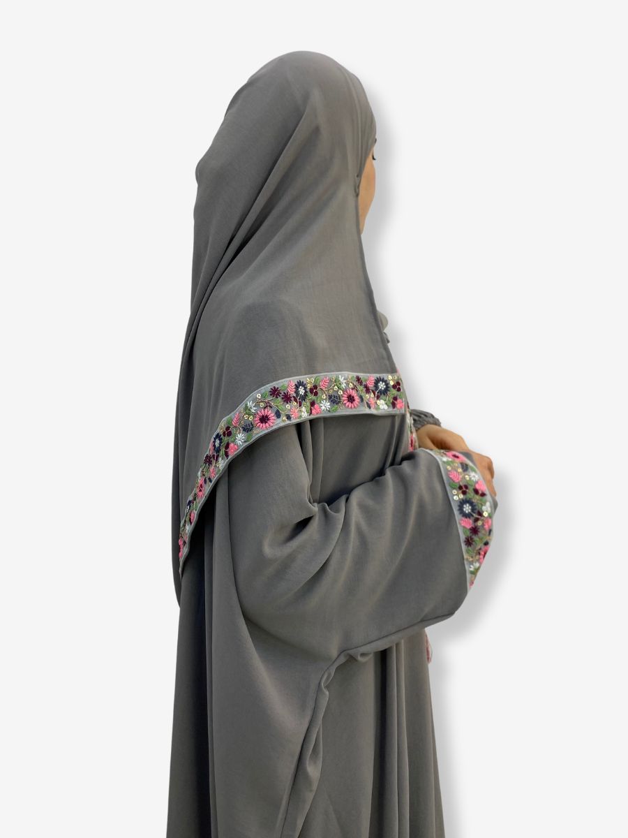 Robe de prière FATIMA – Grise avec broderie florale aux tons pastel et hijab intégré