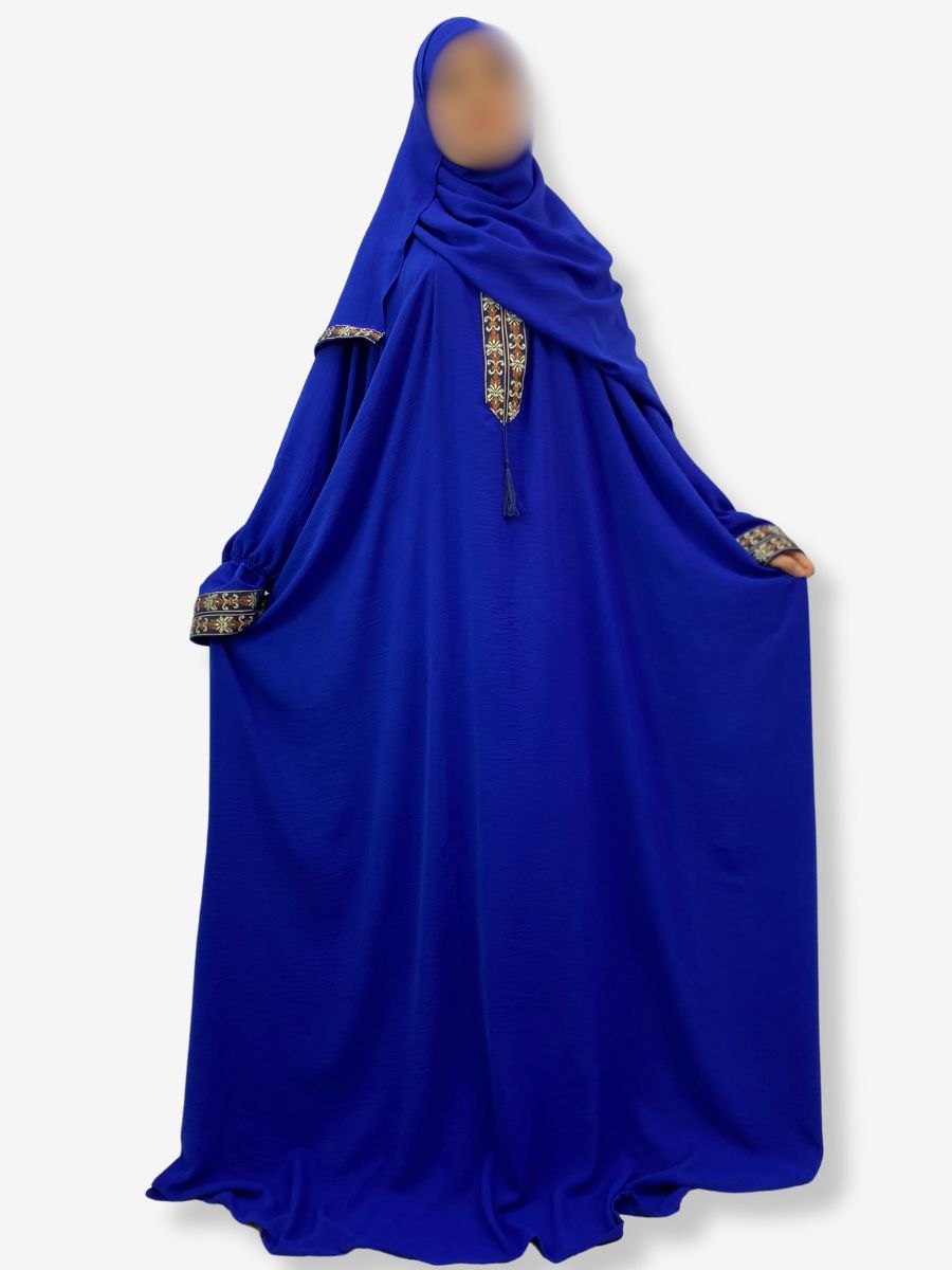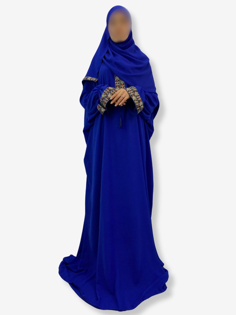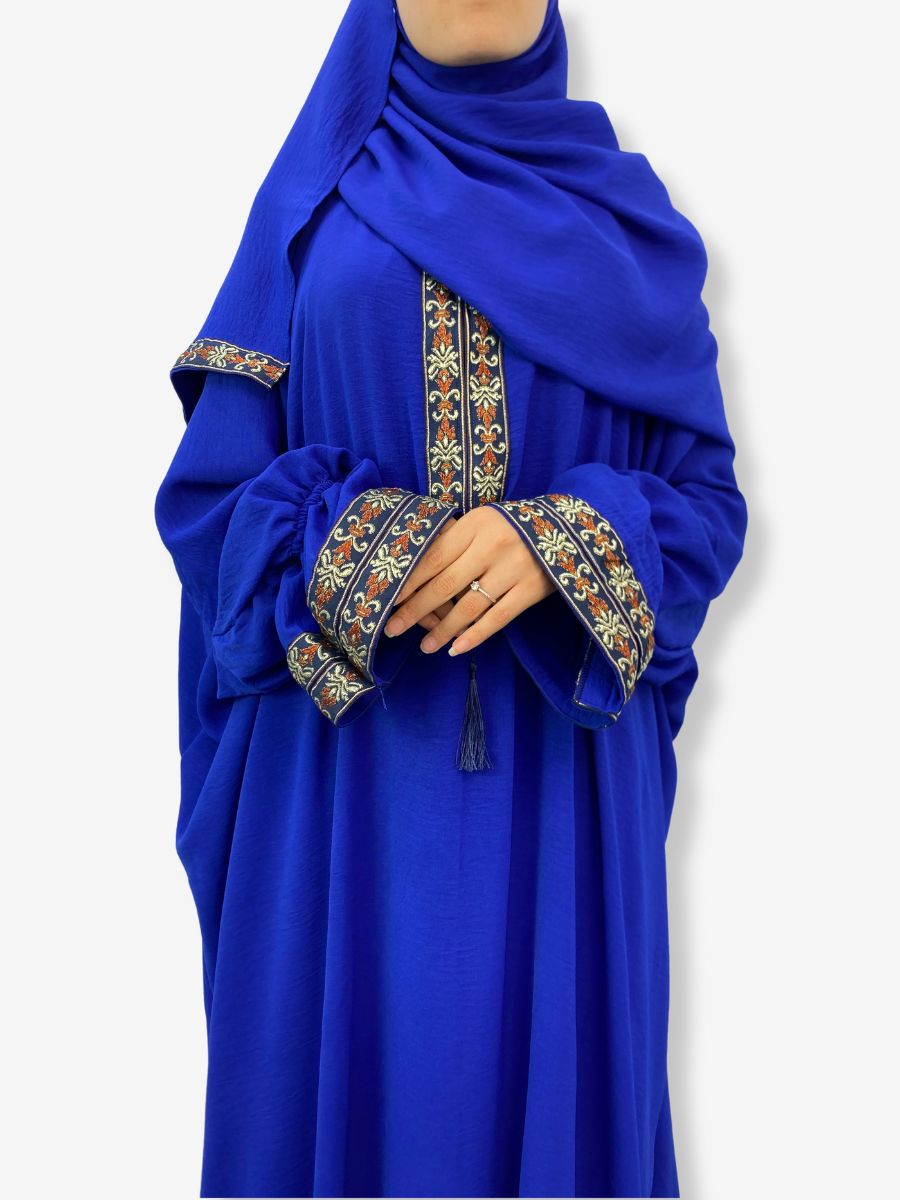 Robe de prière Jewiria – Bleu roi avec broderies arabesques et florales et hijab intégré