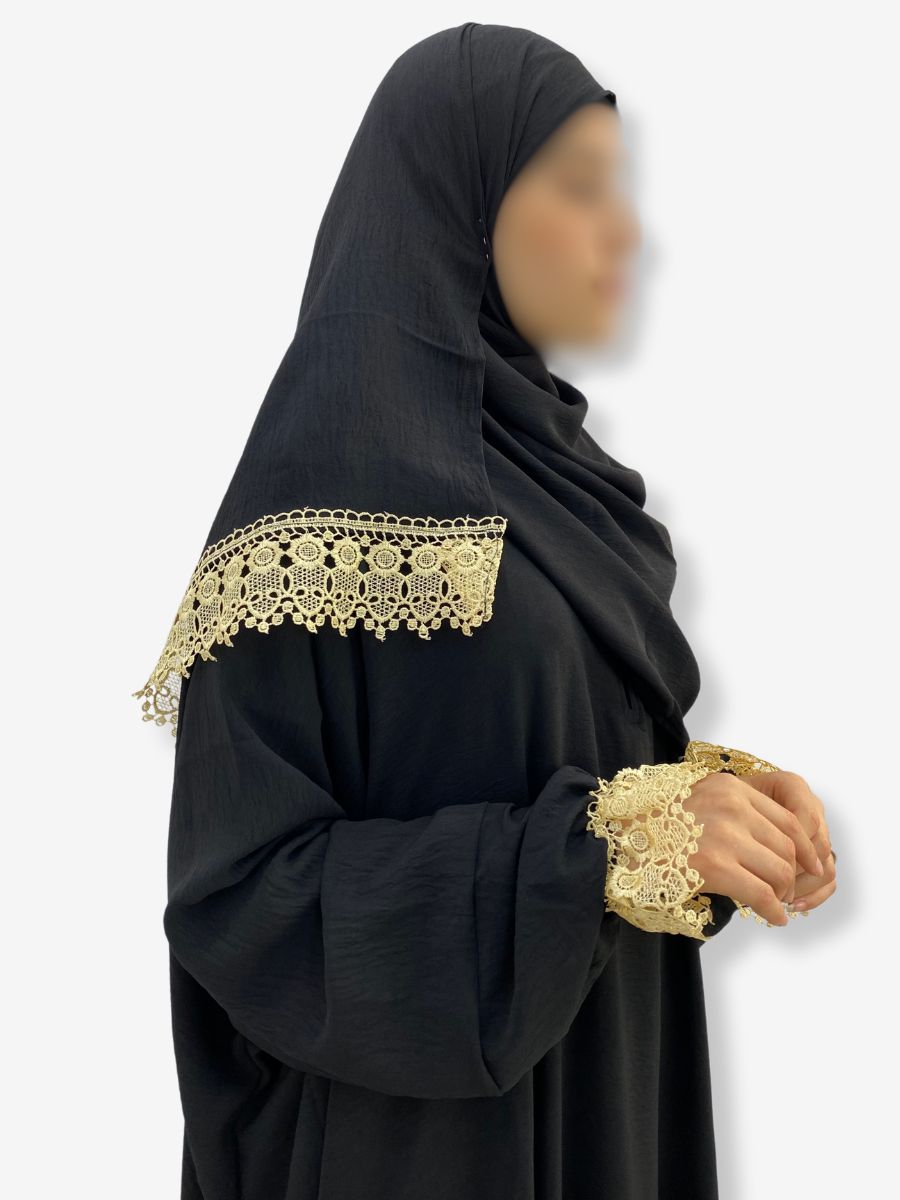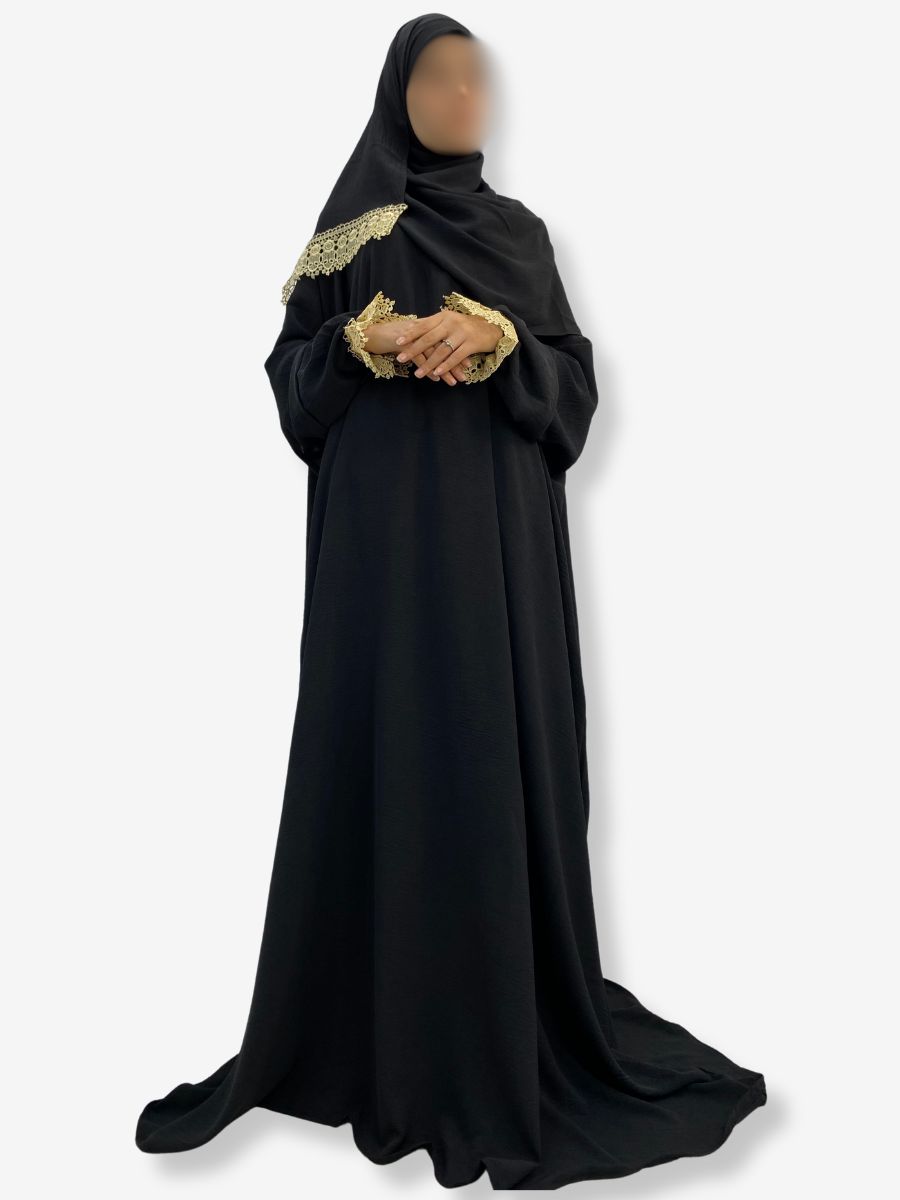Robe de prière SULTANA – Noir avec dentelle dorée et hijab intégré